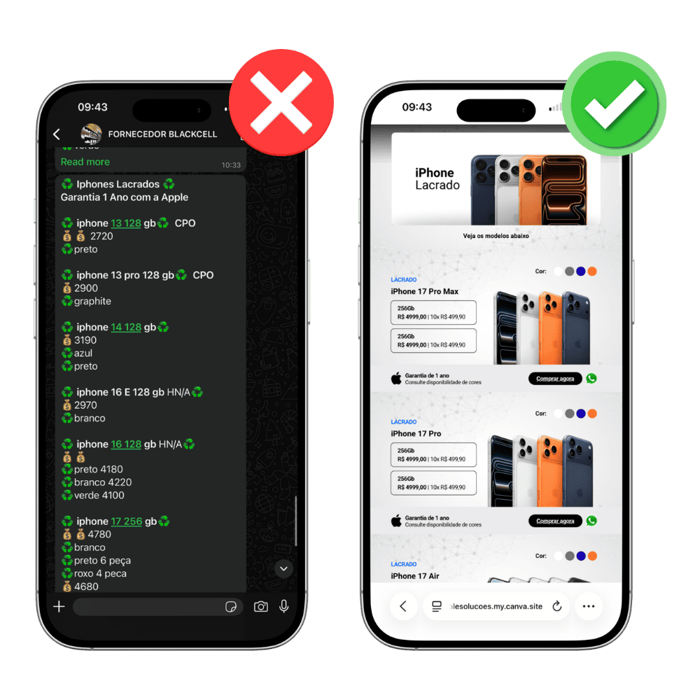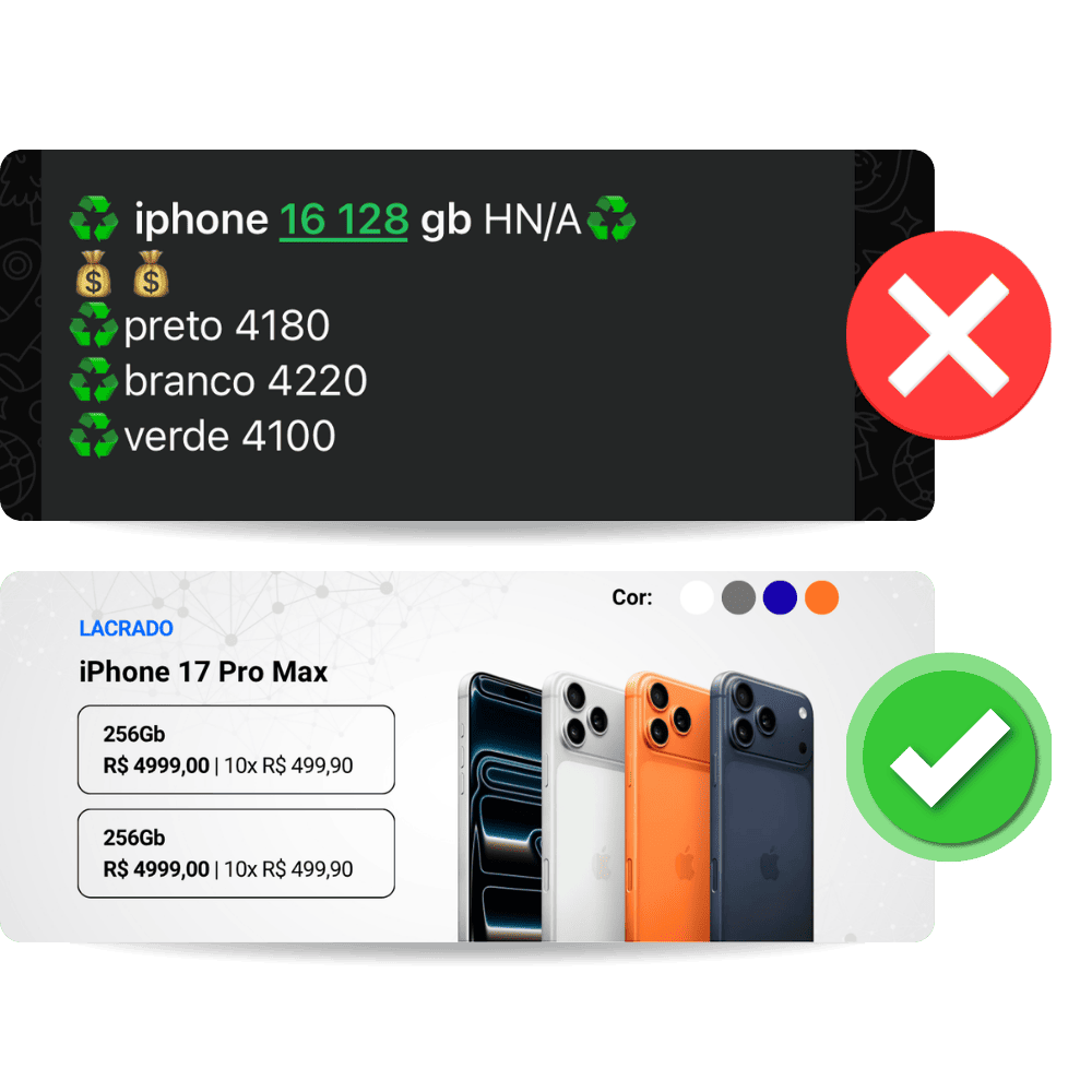Imagina receber uma mensagem no WhatsApp com um textão de preços, sem foto, sem organização…